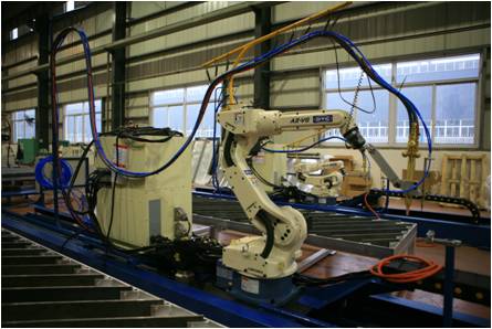 雙工位切割機(jī)器人工作站主要用于電力機(jī)車和煤機(jī)產(chǎn)品碳素鋼、低合金高強(qiáng)度鋼板材坡口的切割加工。為有效提高生產(chǎn)效率,減小工人勞動(dòng)強(qiáng)度,工作站采用H型雙工位布局,兩個(gè)工位平行分布于機(jī)器人前后兩側(cè)。采用預(yù)約工作方式,一個(gè)工位切割的同時(shí),另一工位進(jìn)行工件的裝卸。 機(jī)器人系統(tǒng)選用日本OTC公司的AII-MV6六軸機(jī)器人,工作半徑達(dá)1402mm??紤]到工件切割范圍較大,工作站增加一機(jī)器人移動(dòng)外部軸,作為機(jī)器人第七軸與本體聯(lián)動(dòng),以進(jìn)一步擴(kuò)展機(jī)器人的工作范圍。